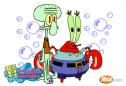 Mr. Krabs (the red one on the right) is Sponge bob's boss, at the Krusty Krab.He's a real cheepskate.Squidward Tentacles (the blue one on the left) is Sponge bob's neighbor & coworker. Squid is a real negative Ned.